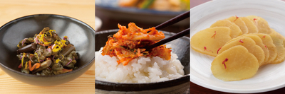 りんご酢のピクルス山形物語40g、本格キムチ、べにばな染めたくあんスライス
