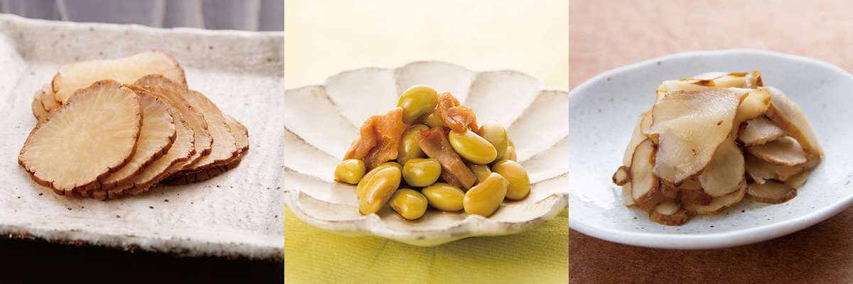 7月:いぶりたくあんスライス、まめでたっしゃで、きく兵衛甘酢漬