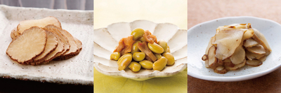 いぶりたくあんスライス、まめでたっしゃで、きく兵衛甘酢漬