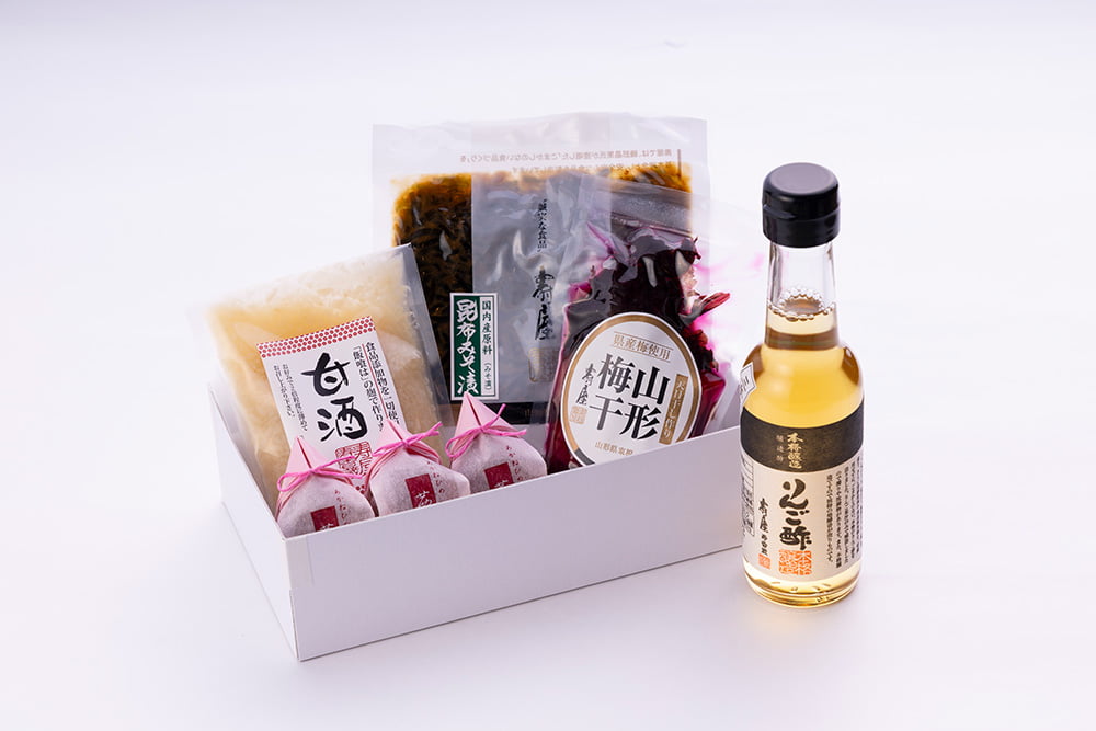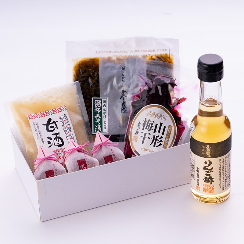- 昆布みそ漬、山形梅干塩分17%、甘酒、茜姫ひとつぶ×3粒、本格醸造りんご酢150ml、初夢 七福神縁起
