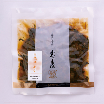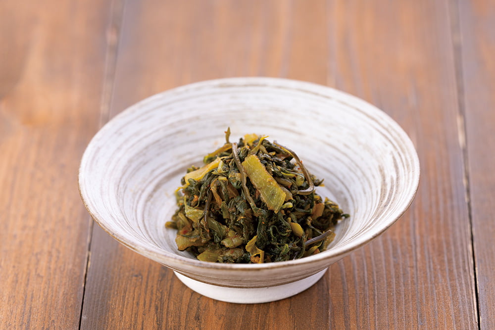 青魚100%の魚醤、風味豊かな唐辛子、自社製造の米麹甘酒など、厳選した14種類の素材を丁寧にブレンドした自家製ジャン。甘いキムチとは一線を画す、旨味とキレを重視した仕上がりです。ここに刻んだ青菜漬を混ぜ込みました。青菜の存在感が際立ち、辛さの中に、魚醤と甘酒の奥深い味わいが感じられます。