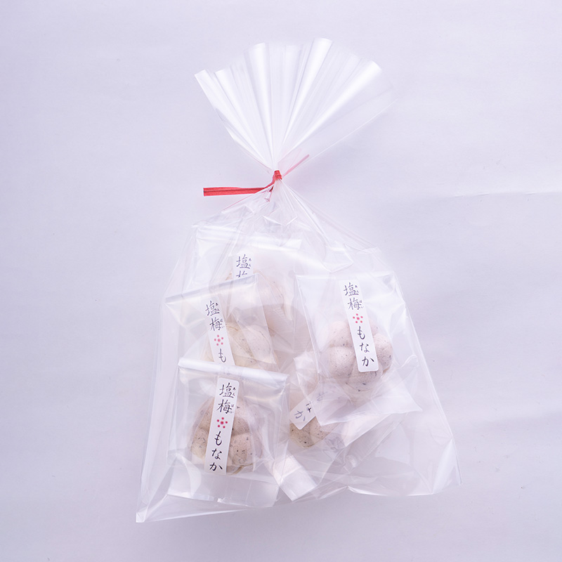 はじまりはスタッフの遊び心でした。いつも作っているあかね姫もなかに梅干のかけらを入れてみたところ、甘くて塩っぱくて、不思議なおいしさのもなかが出来上がりました。ここから白あんと梅干のミックスを佐藤製餡所さんに、皮に紫蘇を混ぜ込み、色あいと風味付けを種工匠土田さんにお願いし、何度も試作を重ねて出来上がった「塩梅もなか」。甘みとしょっぱみが絶妙ないい塩梅のもなかが完成しました。人気者になれそうな予感です。