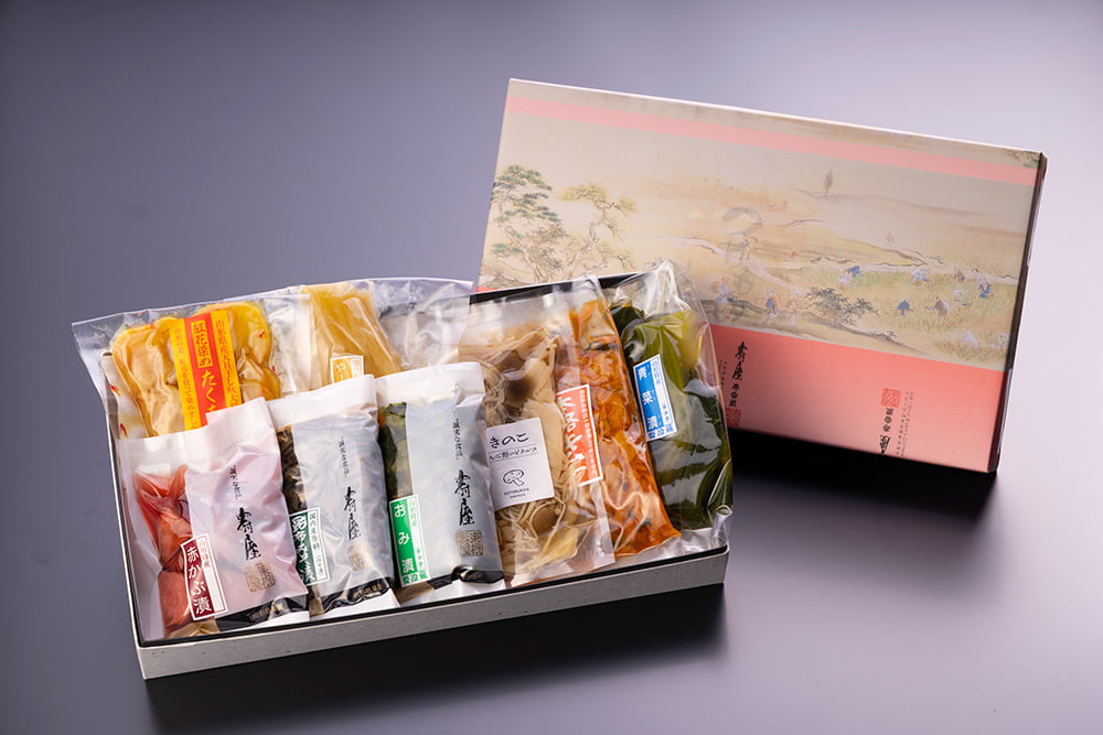 赤かぶ漬、昆布みそ漬、おみ漬、りんご酢のピクルス(きのこ)、本格キムチ、青菜漬、紅花染めたくあんスライス、やーこん粕漬