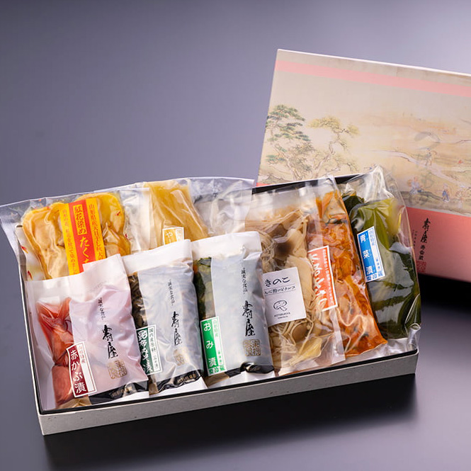 - 赤かぶ漬、昆布みそ漬、おみ漬、りんご酢のピクルス(きのこ)、本格キムチ、青菜漬、紅花染めたくあんスライス、やーこん粕漬