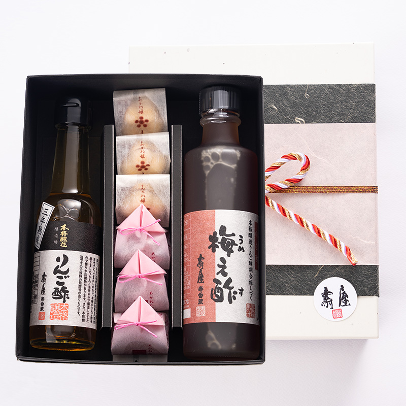 本格醸造りんご酢 [150ml]、梅え酢 [275ml]、茜姫ひとつぶ×3粒、あかね姫もなか×3個、初夢七福神縁起